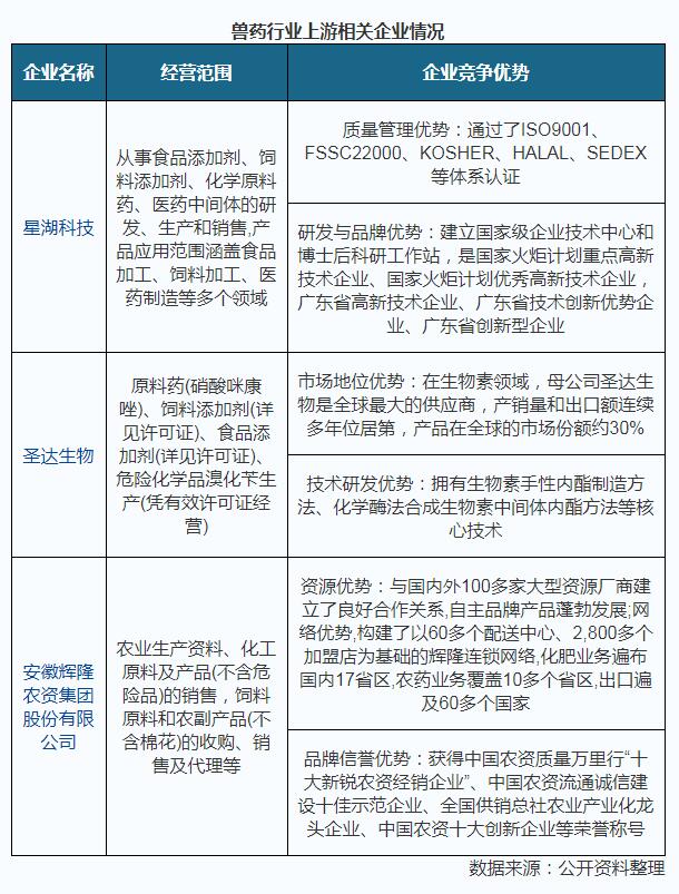 現階段,我國獸藥行業上游的企業主要有星湖科技、圣達生物、安徽輝隆農資集團股份有限公司等。